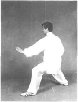 图2—275图2—275动作三接上势身体微右转重心略左移两手逆缠下分(图2—275)。
