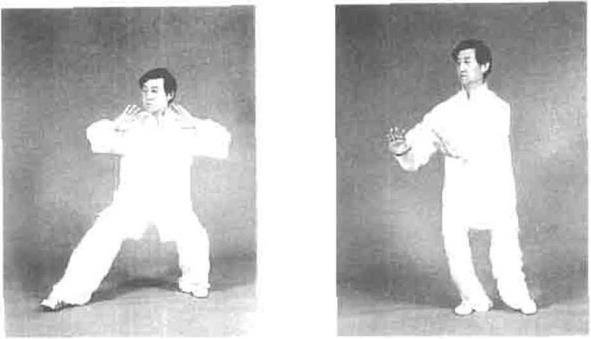动作二接上势,右脚震脚落地左脚向左前方上一步身体向右转45。同时两手交叉于腹前目视前方(图2—274八