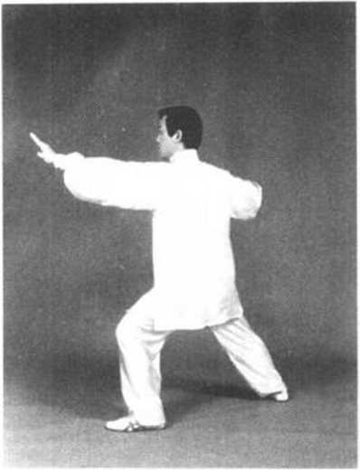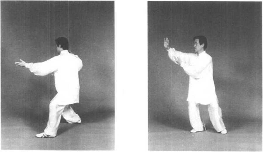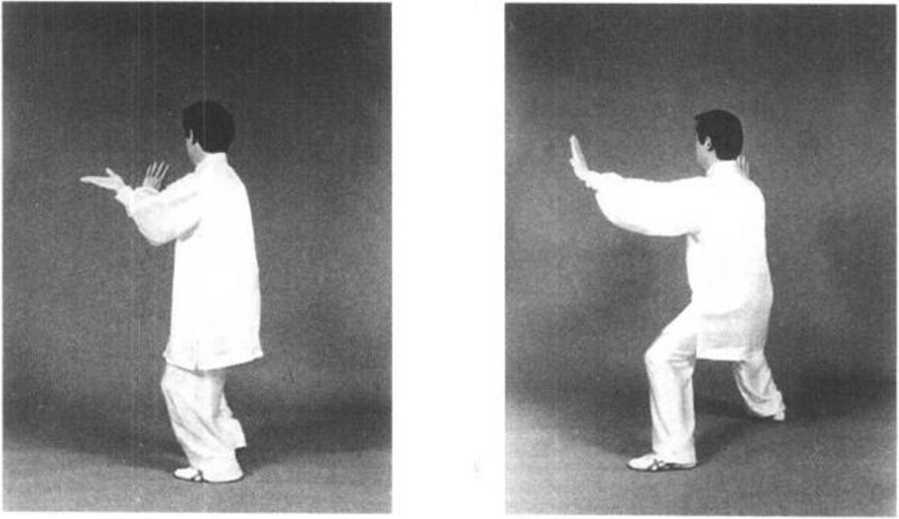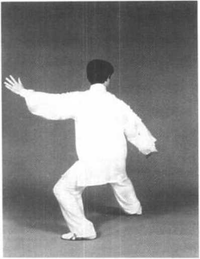 图 5-94图 5-94方开步。双手逆缠上搠,然后微 逆缠向左右展开,至与肩平时松 肩沉肘,下沉合住劲;双手拉开的 同时,重心由左脚走下弧移至右 脚。目视前方(图5—93)。