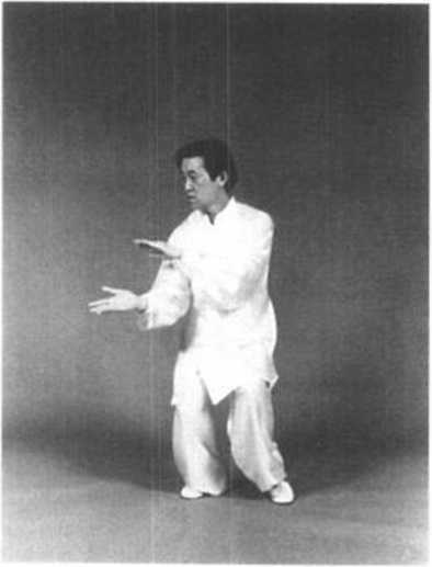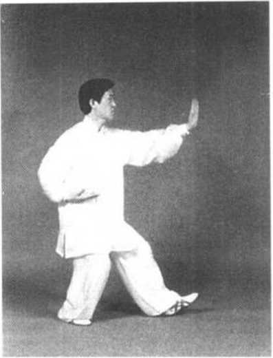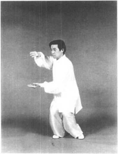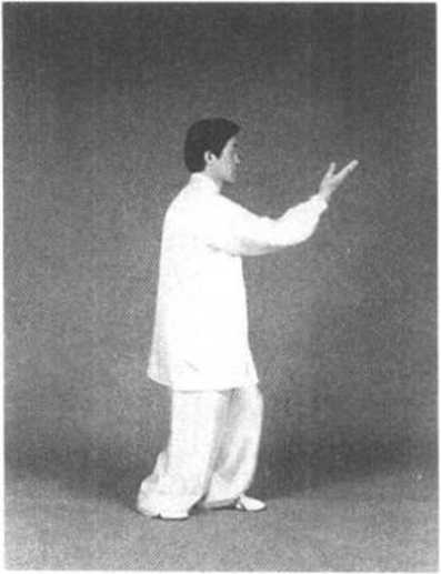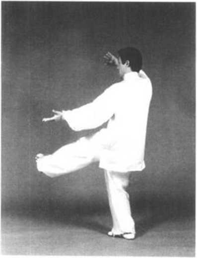 领起左脚,使身体以右脚为轴向 右后转360。,重心控制在右脚, 左脚跟着地,脚尖上翘。左手立 掌伸臂在前,右手掌心向上置于 身体右侧。目视前方,耳听身后 (图 5—110、图 5—111)。