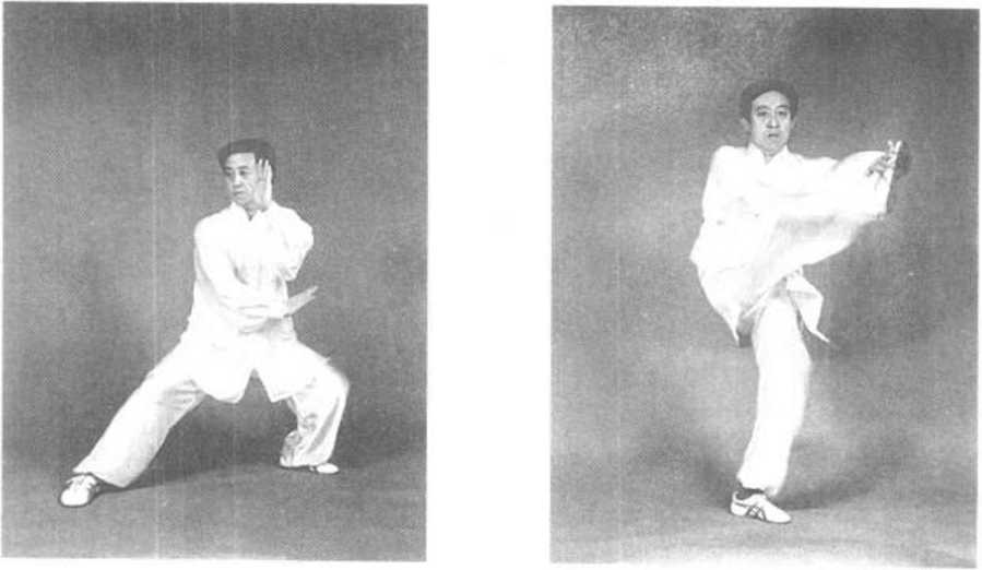 2 .此式由合到开,由开到合,既有双手相吸相系的开合对称 劲,还有胸膝相吸相合的胸腰折叠劲和手与脚,肘与膝,肩与胯的 外三合劲,要求以腰带动,上下相随,顶劲领起,身法中正。