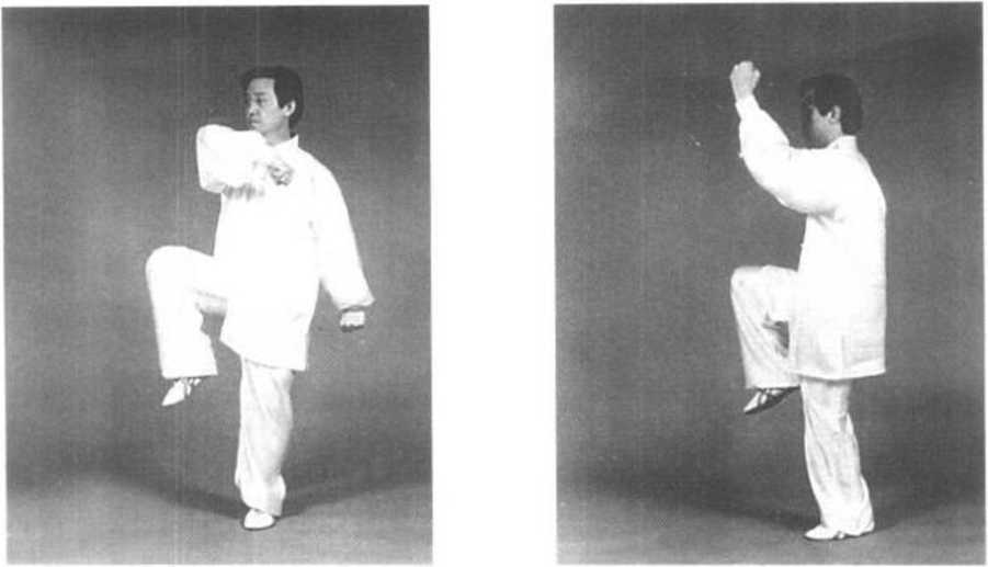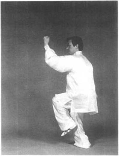 动作五:拍脚后右脚仍屈膝 提起悬于裆内,以左脚跟为轴身