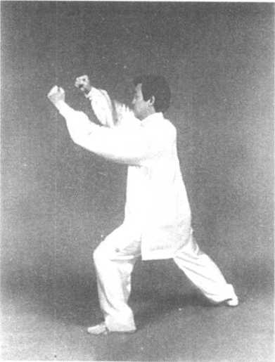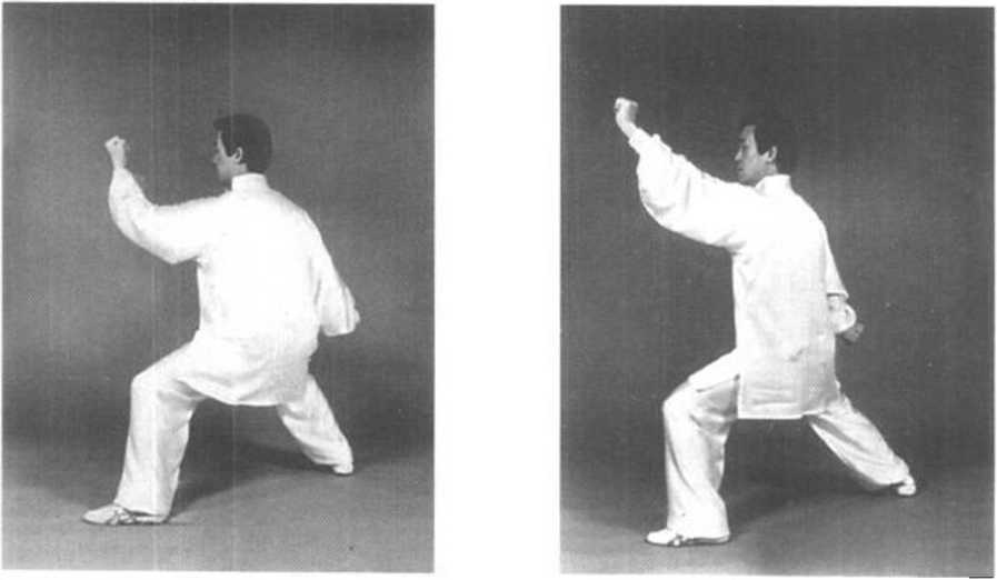 左拳微逆缠至左上方,双拳一齐发劲。右拳与右胯平,拳心向上; 左拳略高于头,拳心向右。顶劲领起,目视前方,耳听身后(图4一 388、图 4—389)。