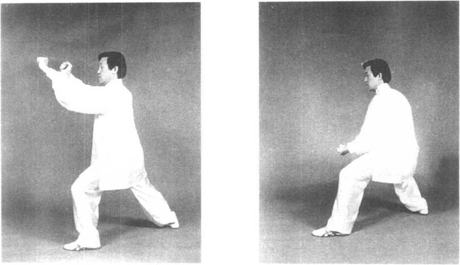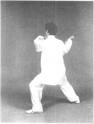 图 4—390图 4—390动作二:身体微左转,右拳顺 缠走下弧向左上和左拳形成合劲 (图4—393)。松右胯身体右转, 重心右移;同时双拳左顺右逆缠