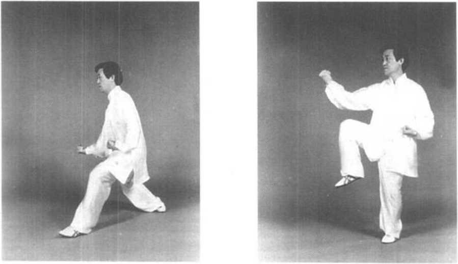 法低,要注意身法中正,顶劲上领,切勿前俯后仰。发劲须富有弹 性,一发即松,以免前俯失重。