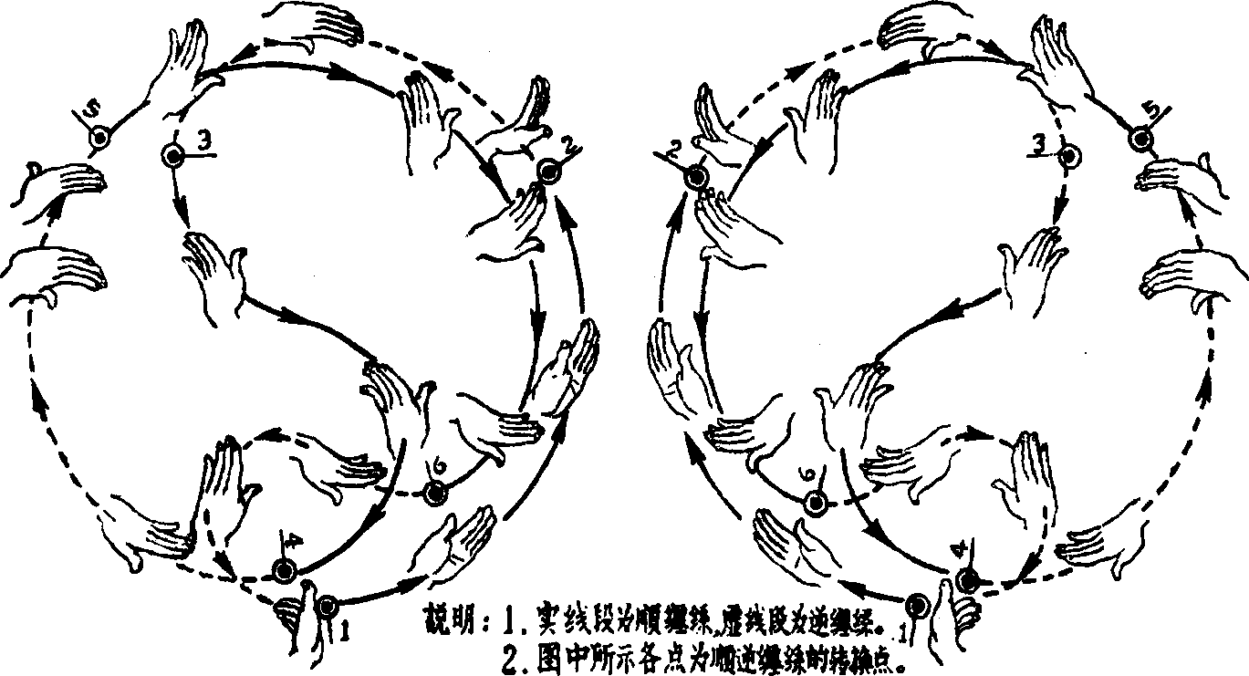② 所谓由内往外翻或由外往内翻,皆以食指的翻转为标准。如图1中,手 从点1到点2,此时食指的运动系由内往外翻,故为顺缠;手从点2到点3,食 指的运动则为由外往内翻,故为逆缠。