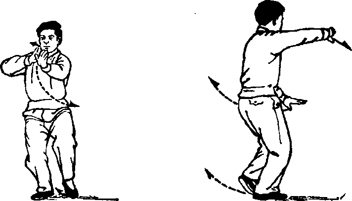 5 .此式也可作形于外的发劲,即撤步后退至落点时,足 跟蹬地作声,同时前手劲往外发,后手用沉劲沉住。