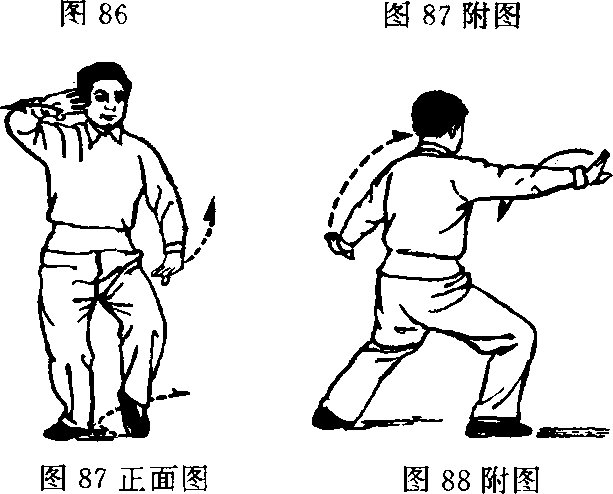 推出;左掌在胸前经前伸的右小臂下侧交叉而过,即由左下方 随左脚后撤时向左后弧形展开。(图87和88附图及正面图。 图87.88两图中姿势的方向已转为与动作说明中的方向相 符0前面的图86和以后的图89-92中所示皆其正面,其实都 应与图87和88附图的方向同,都是胸部朝着正东方向做动 作)