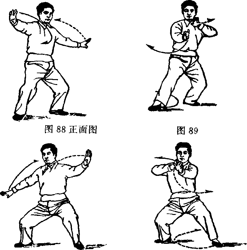 动作二:两手和两腿各顺缠一小圈(以转劲),接着重心 左移。同时,左掌自左而上由顺缠转逆缠,弧形缠至左颊旁, 掌心斜朝右前方;右掌以小顺缠到大顺缠,自右而左缠经胸 前而下。(图89)右脚提起,经左踝旁向右后(西南)斜方以 弧形撤步,重心随着后移,右腿变实。同时,左掌逆缠向前 推出}右掌在胸前经前伸的左小臂下侧交叉而过,即由右下 方随右脚后撤时向右后弧形展开。(图90)