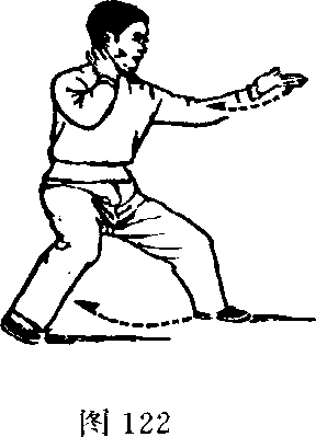 动作二:身体左转,重心移于右腿。同时,右手转臂逆 缠至右手旁,掌心斜朝里;左手小顺缠向右合,掌心朝上。 (图122)以右脚跟为轴,身体继续左转,重心全部移于右腿,