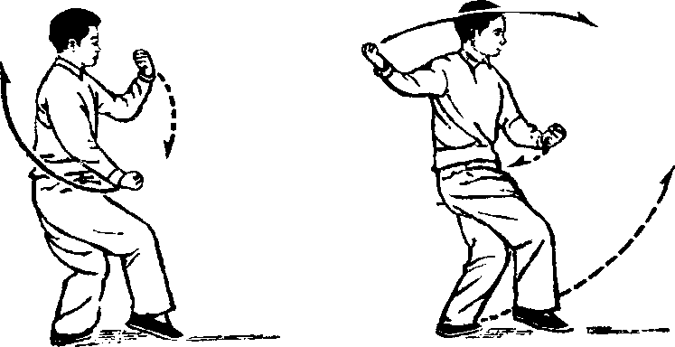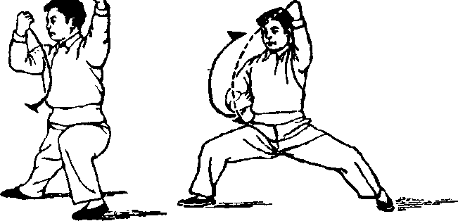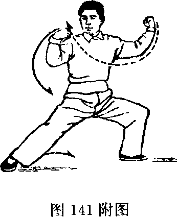 动作一:身体右转,重心在左脚,右腿微伸不挺直;同 时,左拳屈臂随转体微下移,右拳转臂、屈肘、屈腕上举,两 拳心皆朝里。.(图141,附图141的正面图)以左脚跟为轴,身 体继续右转,脚随转体收回半步,以脚尖点地。同时,右拳 顺缠向身体右侧下落,拳心朝上;左拳逆缠自左而前屈肘上 举,拳心朝里。(图142)重心移至左腿,左腿下蹲(加强左 腿弹性);同时,右拳转臂逆缠自身后弧形上举,左拳逆缠向 身体左侧下落。(图143)