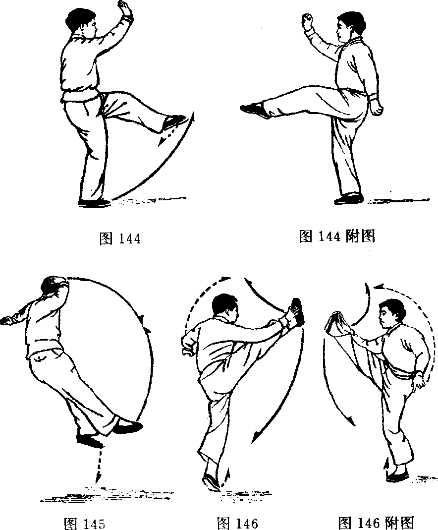 动作二:重心前移,右脚跟落地踏实,左脚绷平脚面向前 上方踢起;同时两拳变掌逆缠,右手向前上、左手向后下划弧, 右掌心朝前,左掌心朝里下。(图144,附图144的正面图)左 脚尚未落地,右脚即蹬地跃起,向前上方绷平脚面踢起,右掌 即向前迎击右脚面,随即左脚落地,左掌在右掌迎击右脚面时 向左平举。(图L45— 146,附图146的正面图)