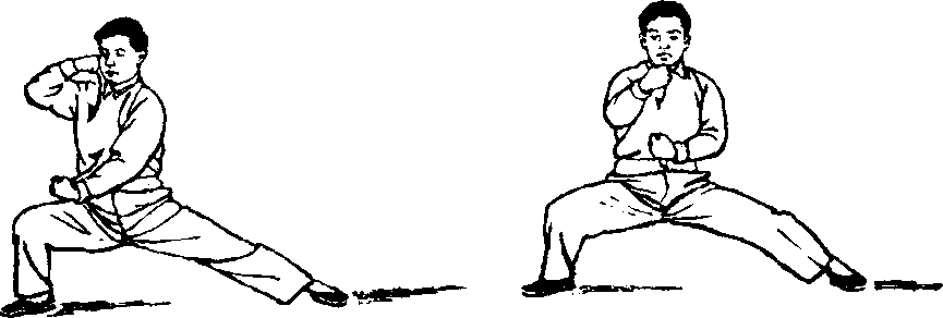 3 .此式动作起来裆口要求低(但低不过膝),它在变换 腿中虚实时,尤易感到会阴(前后阴之中部)之气上冲尾闾, 这是表现在此式内的圆裆的主要要求。