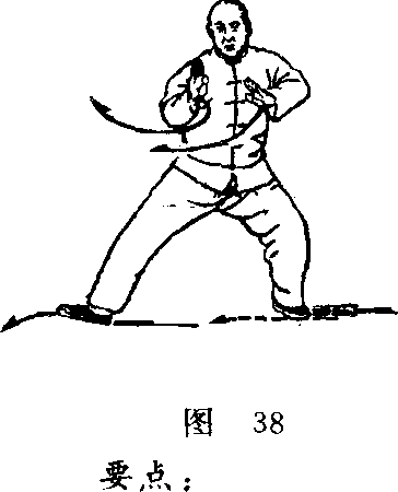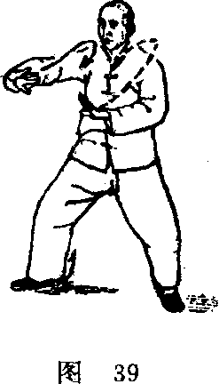 蓄起来,变右足为实。然后双手又立即由前向左后顺缠而下。 当双手下塌时,又变左足为实。这是在前一蓄劲的基础上再 加一蓄。最后以双逆缠发出搠劲。此时右掌心向外,左掌心 向下。在发劲的同时,右足向前迈进半步,左足亦随之跟进 半步,足跟铲地有声。(图38、39)这是第一个连珠炮动作, 本式共有三个连珠炮动作。