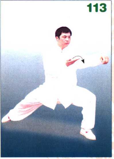 同时右手逆缠 在右胸前向内划一小弧,掌心翻向外, 随身体右转向右前方平云,转至右侧前 方。接着身体稍左转,右腿弓膝塌劲, 成右侧偏马步;随之两肘向下松沉,右 手塌腕立掌,掌心斜向前,掌指向上。 眼看右前方。(图114、115)