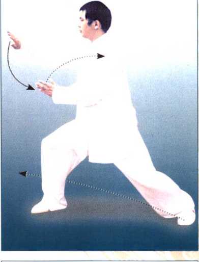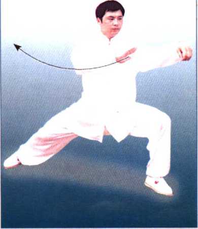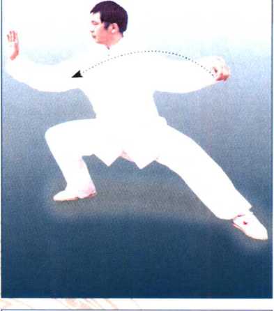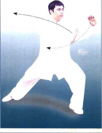【要点】右脚铲出,随之向前弓膝,同 时右肘向前打出,重心向左回转时,右 手上托至左肩前,接着向内划一小弧, 再向右采拉至右侧前方,臂要展平,与 肩同高。随身体左转的同时,右手塌腕立 掌,身体保持中正,步型为右偏马步。