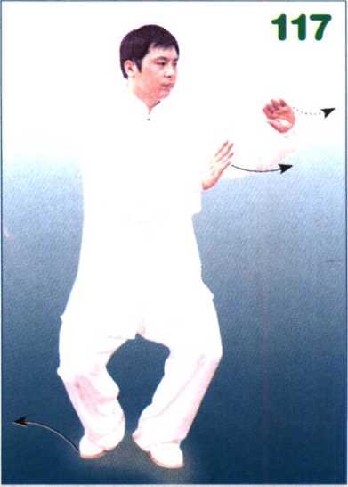 身体左转,左腿弓膝塌劲,身体重 心移至左腿,提起右脚向内收转,落至 左脚的右后侧,脚尖着地,脚跟抬起, 成右后虚步。同时左勾手变掌向上、向 右划弧转至右肘内侧变逆缠,右手顺 缠,两手同时向左侧前方转按,左手掌 心斜向左前下方,掌指粤向前上方;右 手至左肘内侧,掌心向'左,掌指斜向 ±o眼看左前方。(图116、117)