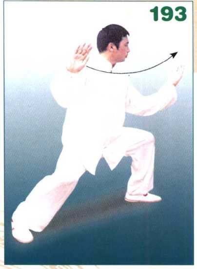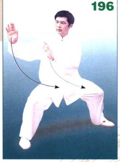 身体继续左转,随之两手向前下方 击拍,手同腹高,掌心斜向下,掌指斜 向右,眼看两手。(图197)