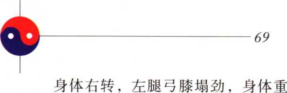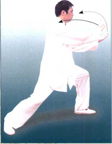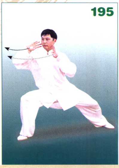 197197身体左转,左腿弓膝塌劲,成左弓 步,右腿微屈。同时两手向右前方伸 出,右臂稍屈,手与肩同高,左手至右 肘内侧,掌心均向外,掌指向上。(图 196)
