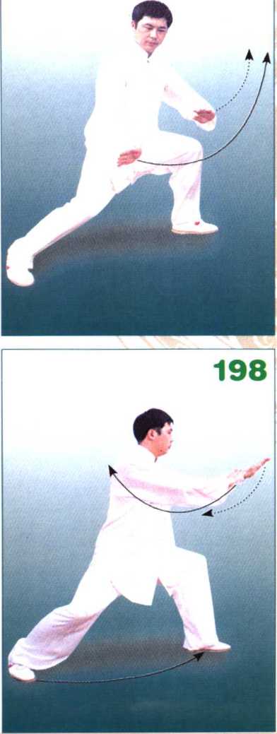 身体稍左转,步型不变。同时两手 向左前方伸出,掌心向下,掌指向前。 0198)
