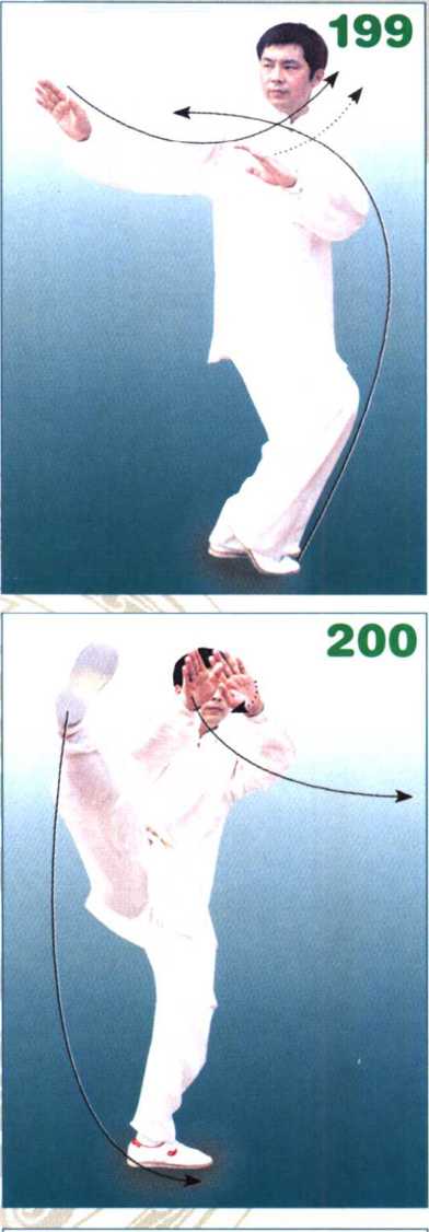 身体左转,左腿微屈弓住塌劲,右 腿伸直向前上方踢起,脚于头同高时展 胯,向右平摆,脚尖向内扣;同时左手 逆缠,右手顺缠,两手向左前方平摆, 用手掌依次迎拍脚面。(图200)