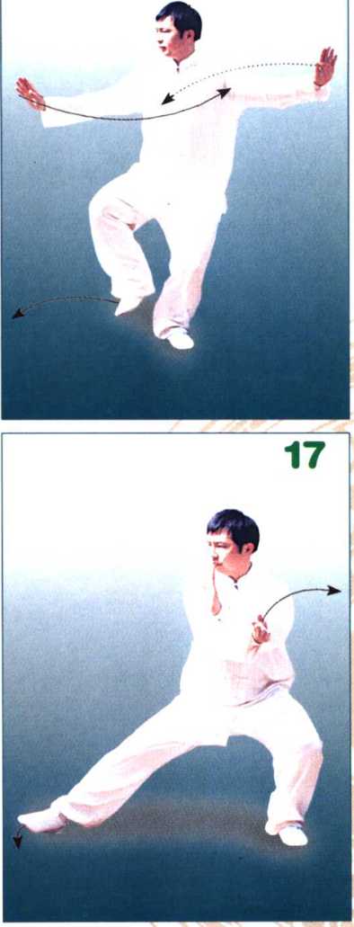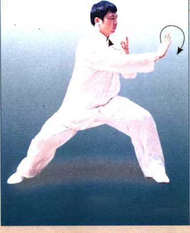 身体向右转正,步型不变,仍为正 马步。右手逆缠向上、向右划弧转至有 侧前方,手同肩高,掌心斜向右前方, 掌指斜向上;左手随之逆缠向右经右肘 向下、向左划弧转至左侧前方,手与腹 同高,掌心向下,掌指斜向左前方。眼 看右前方。(图15)