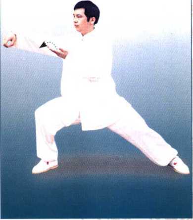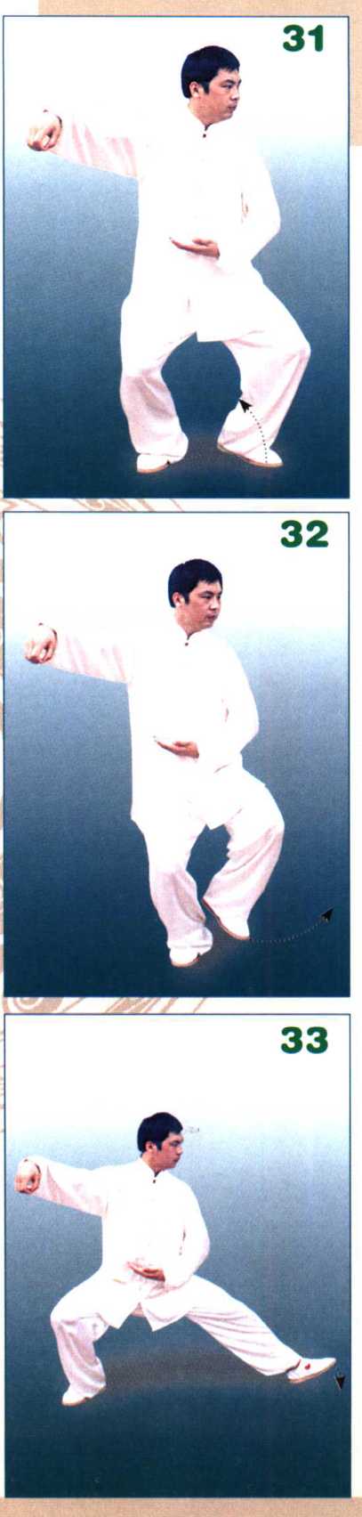 之屈膝前弓,成左弓步,右腿微屈。同 时身体向左平移,左肘随身体向前打 出。(图34)