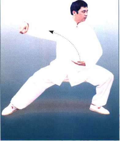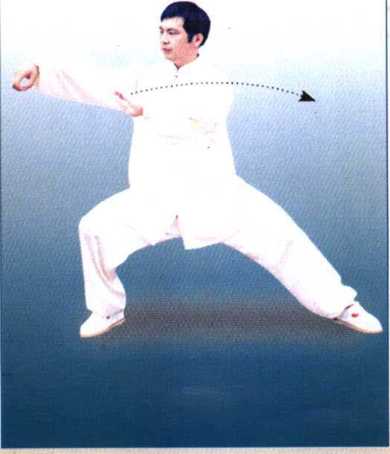 【要点】左脚擦出,随之向前弓膝,同 时左肘向前打出,重心向右回转时,左 手上托至右肩前,接着向内划一小孤, 再向左拉掌转至左侧前方,臂要展平, 与肩同高。随身体右转的同时,左手塌 腕立掌,左腿弓膝成左偏马步。
