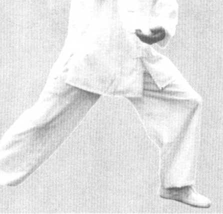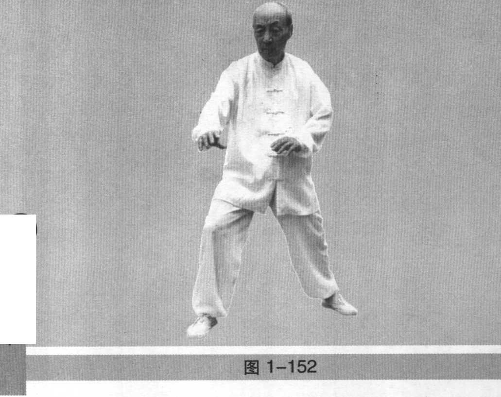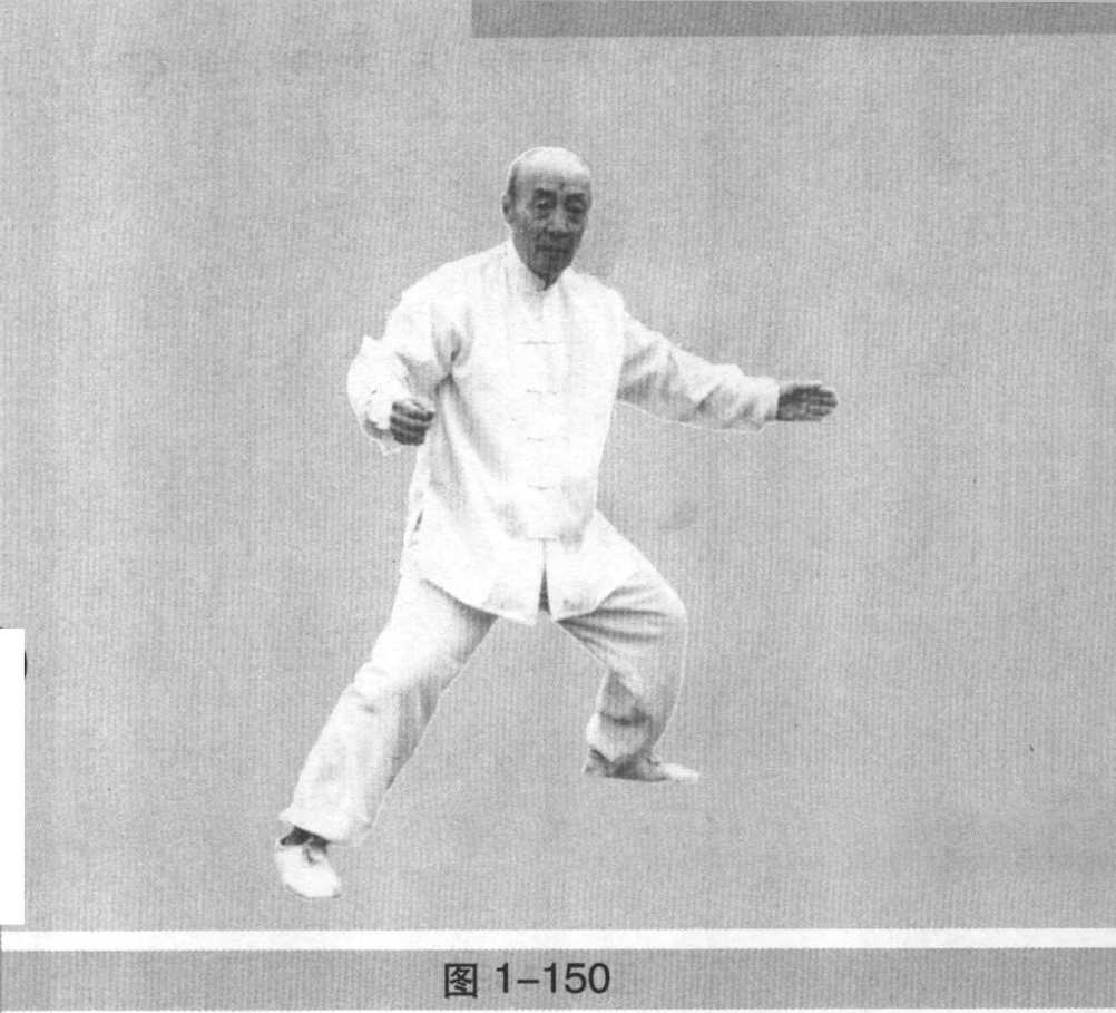 回复如图1-149式样。又再左转,左足自右足后擦地落步。 如图1-150式样。如此循环反复,横行动步,五步或七步 (视场地大小定动步多少)。