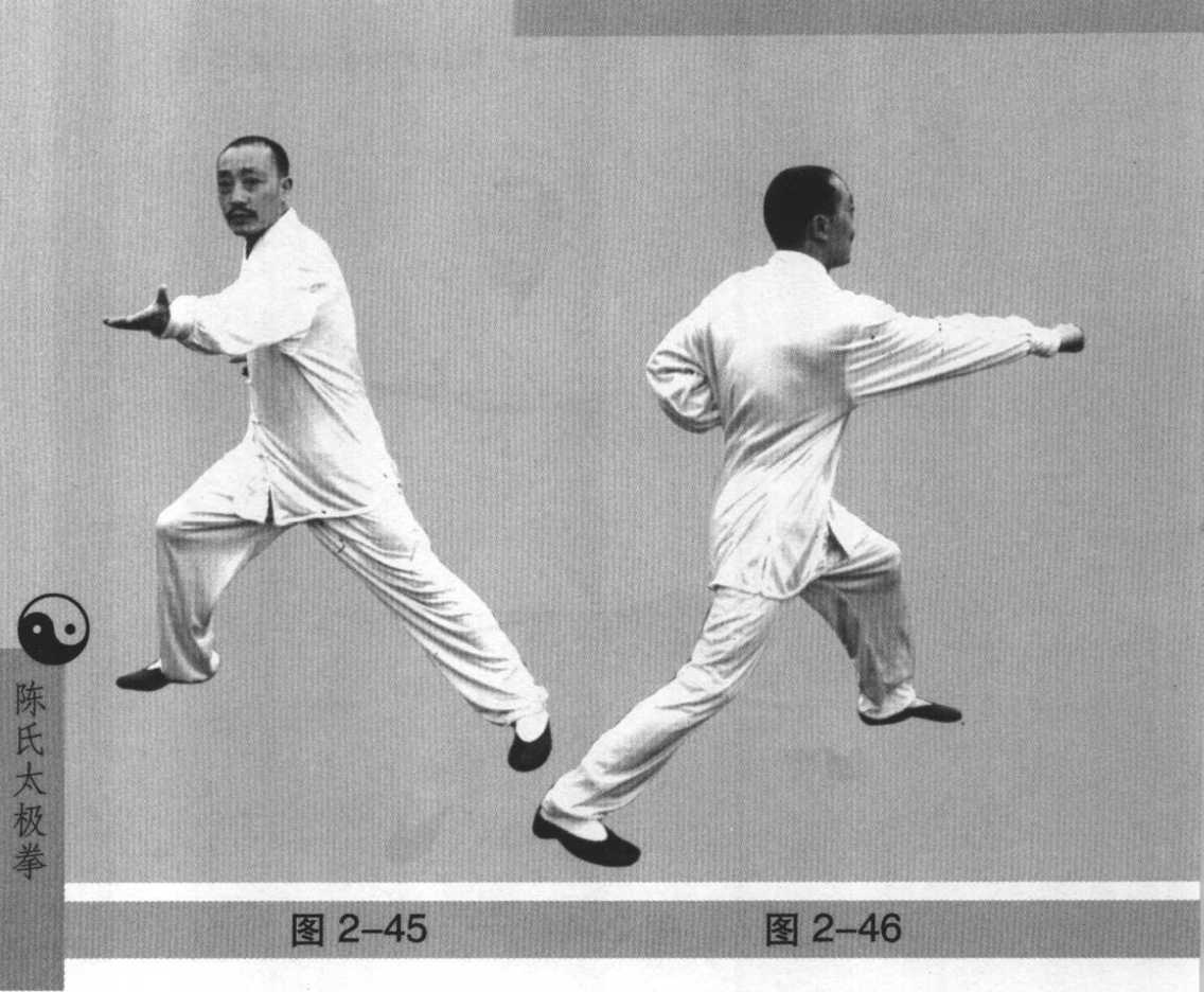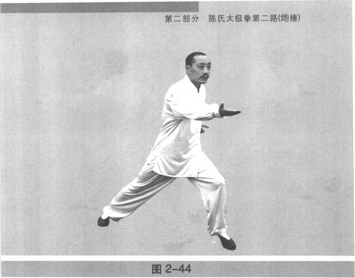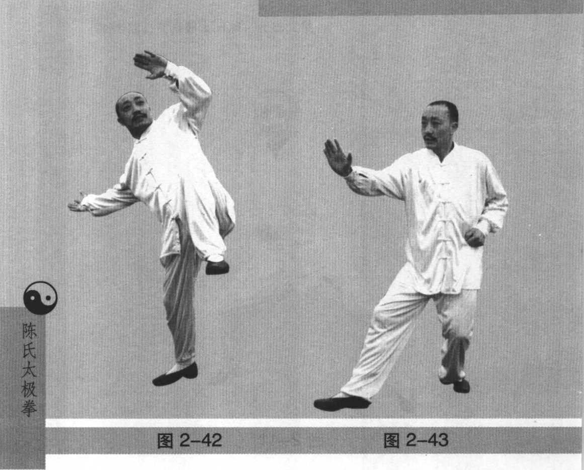 承上式左手左足同时上提,突然跃起,身体左转(图2- 42),此时面转向东南,紧接着转身,左足左手下落,右掌亦 同时弧形上扬,高过头顶,并向前下用掌缘砍下,左手配合 发出肘劲向左后击出(图2-43),整个跳跃转身过程是左右 两足前后交换了位置。