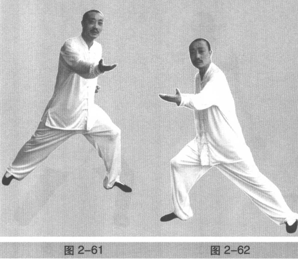 接上式,双手握拳回旋合于胸前,右拳在上,左拳在 下,拳心均向内,接着身体向右转身180度,以左足跟为 轴,由面向东转为面向西,在转身的过程中,双拳自胸前交 叉而过,右拳向右后下发出搦劲,左拳向左后上发出例劲, 拳心皆向前,同时,右足屈膝上提(图2-59、图2-60)o