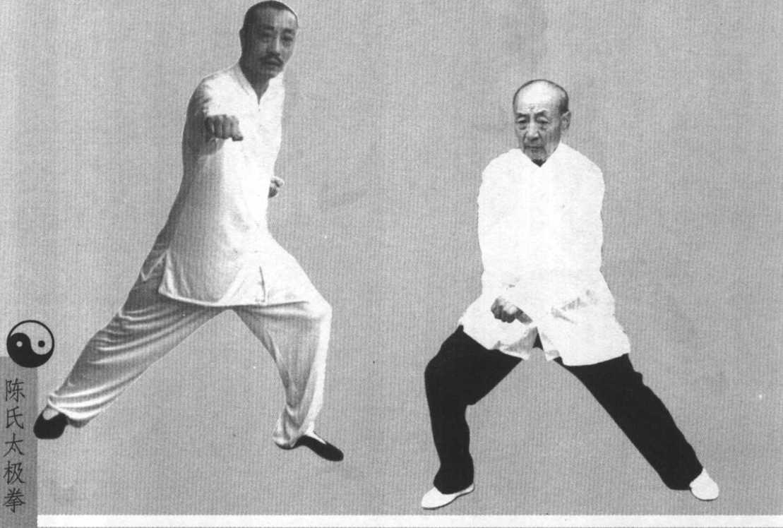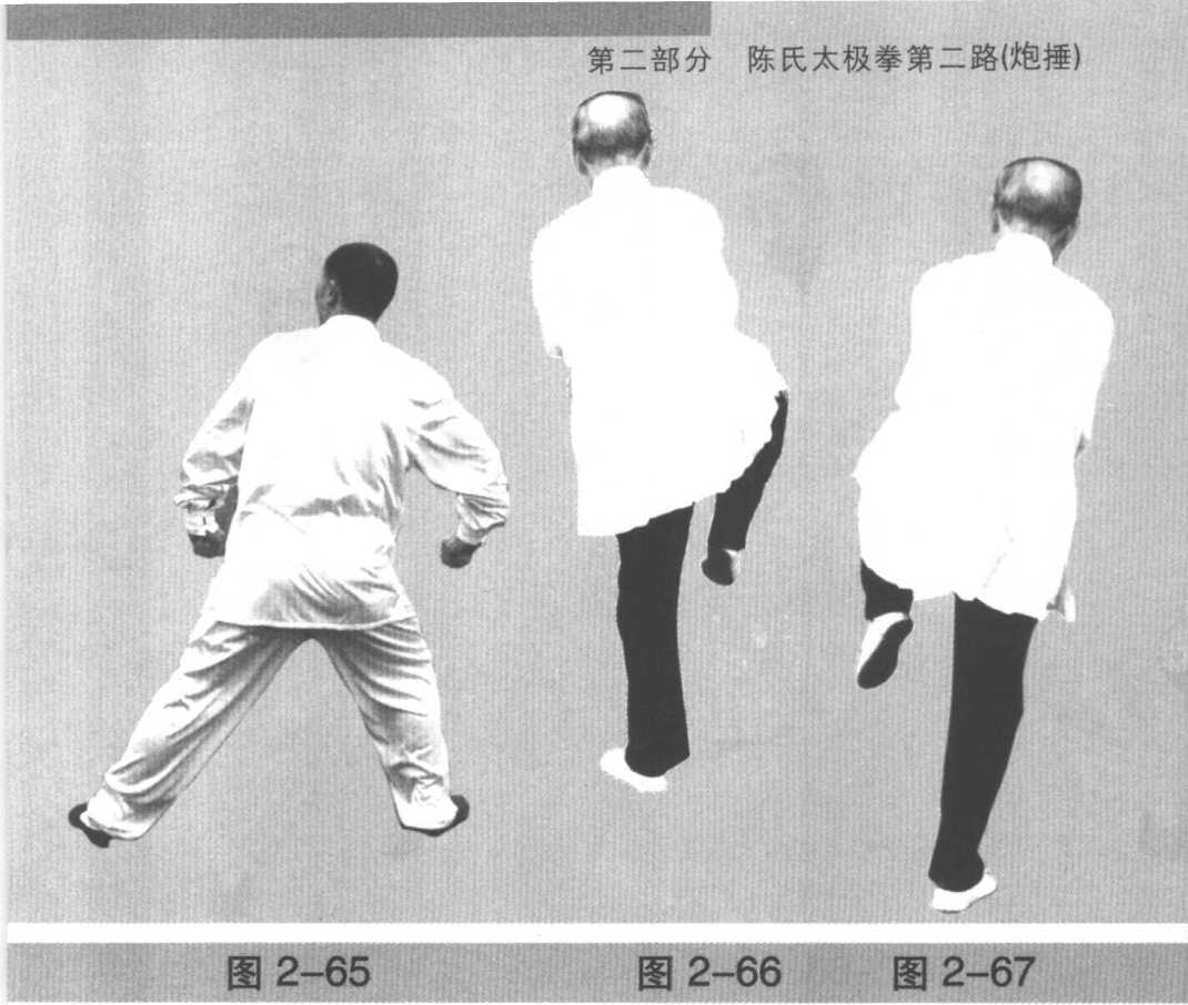 左拳向左后上发劲击人头面部,右拳向右后下发劲是 击人腹胯部位,腰肋部位,都是用反臂捶发出例劲的猛烈 着法。右膝上提亦是撞击人腹、裆的凶着,不可轻用。