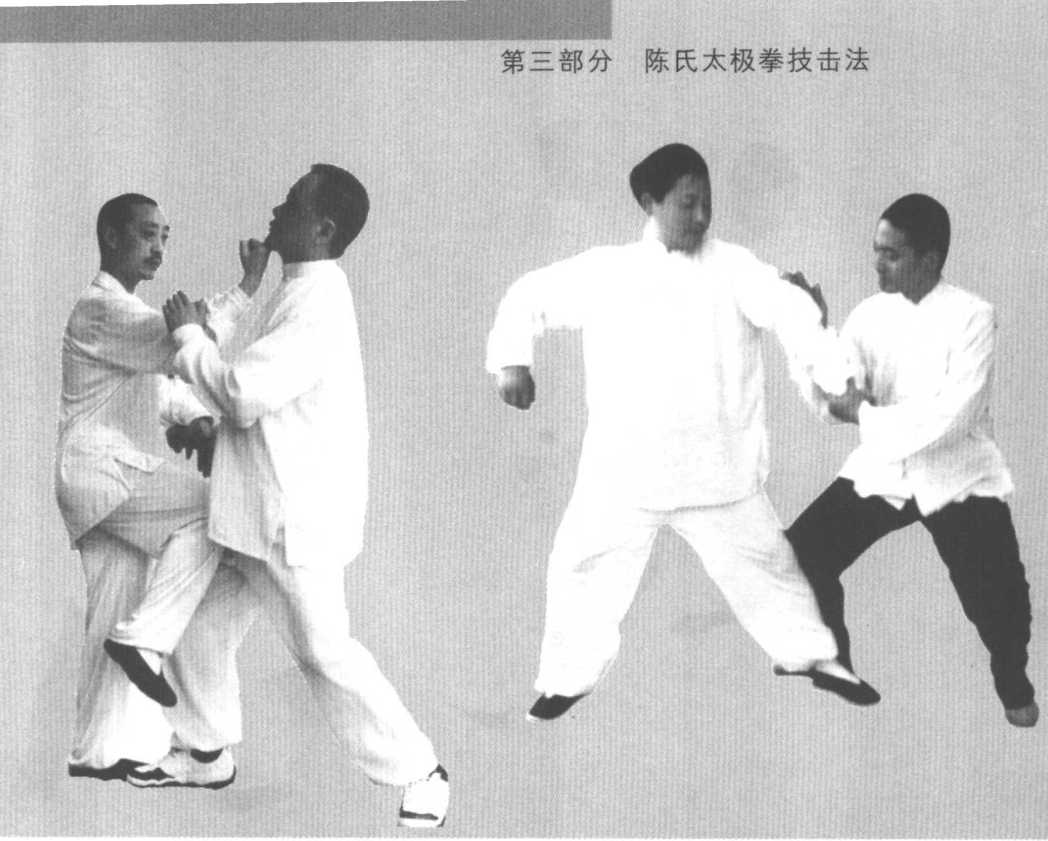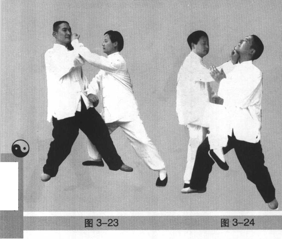 颗,膝撞对方裆部(图3-25),均可将其击倒或重创。至于左 拳,在拳法练习或实际运用中,均是右拳向左上旋转冲击 为主,左拳向左下旋转插打为辅,起着助劲与稳定自身平 衡的作用,即双拳在左侧交叉而过。但是,如遇对方用双手 擒住我左小臂扭转擒拿时,我即顺势借力扭转身躯,顺着 对方劲力,旋转下插,以左拳冲击其腹部或裆部(图3-26)。