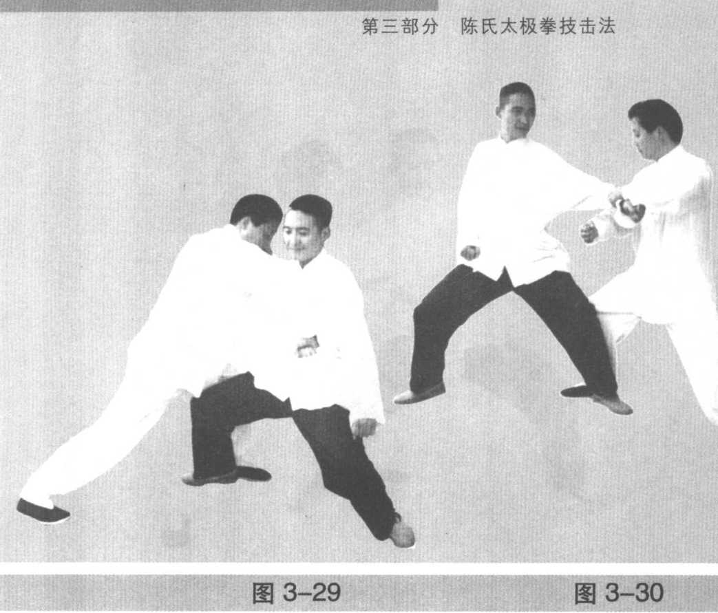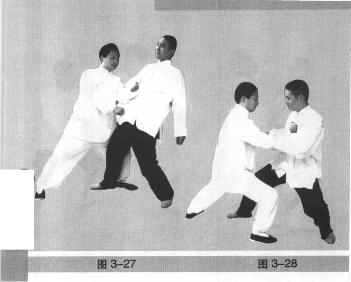 向前上画弧冲击用的是弹抖劲,均是猛烈的化打结合的着 法。对方用右拳或右腿从我左侧攻来,我即原地转身换步 (交换足步的前后位置),在转换中跃起身躯,同时,抡起双 拳向对方攻来的臂部或腿部劈盖,用横劲破直劲,化解来 势。再发劲向前上冲,攻击对方胸、肋部(图3-27),双拳在向 左或右抡起的圆弧,随着功夫的增进愈画愈小。两足在跳 跃中转身交换位置时,亦可以整足助势,或踩对方足面,或 勾套对方足跟,使之不得退避。
