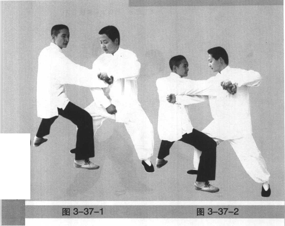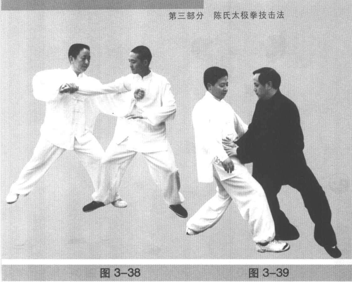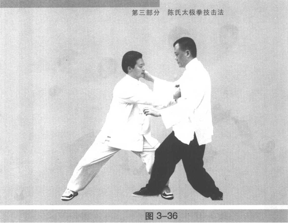 玉女穿梭也是一种拳法。着法是,若我左手腕被人抓 拿,我即左手微一旋转,同时重心略后移,微一沉带,后足 蹬地,飞身向前跃出,左手以挣脱劲出拳或掌冲击对方胸、 腹部,是连解带击的猛烈着法。反之右腕被擒,同样身微后 挫即飞身前冲,右拳一旋一沉发劲冲击,亦可用掌击、指戮 的手法。变着:如右腕被擒拿,或双手被擒拿,我身躯略后 移,微一沉带,卸去对方劲力,右足抢步向前冲出,在右足 落地的同时身向右转,右臂屈肘后带,左手左足直穿进击, 左足插裆,左拳或掌指击戮对方胸、腹部(图3-34)。