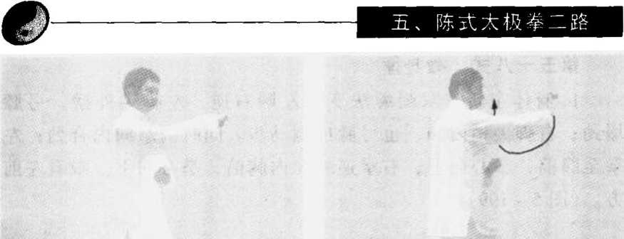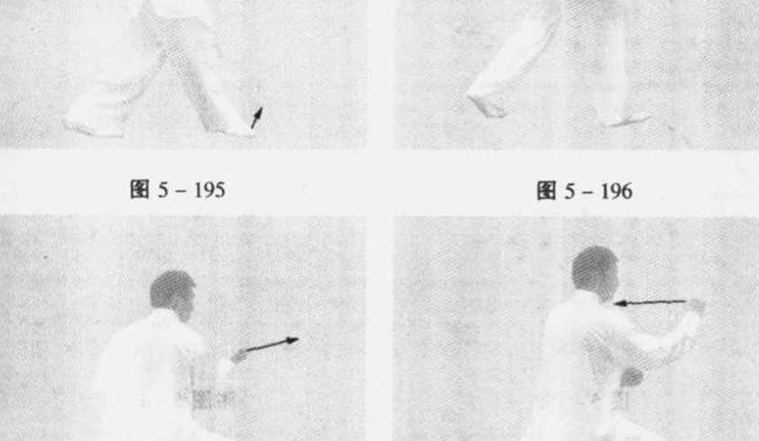 膝向前弓塌成右侧弓步。同时右拳变逆缠,向右前方发力打出, 拳同肩高,臂成弧形,拳心斜向左前下方;左拳也变逆缠,随右 拳向前发力转至右肘内下侧,拳心斜向内。眼法不变。(图5- 198)