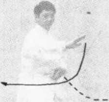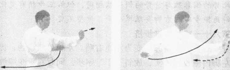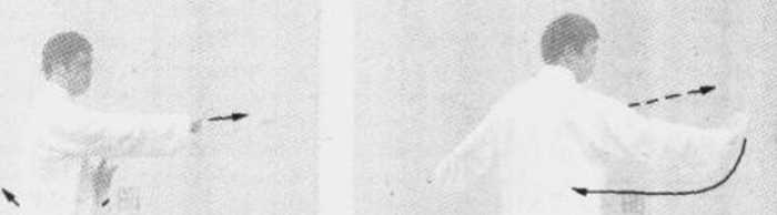 1. 身体左转,左腿变顺缠,下落,脚尖着地向左后斜方撤 步,约一肩半宽,落下脚跟;右腿逆缠,弓膝塌劲,成弓步,接 着,以脚跟为轴,脚尖翘起向内扣转,成马步。同时左手变顺缠 沿身体向下转至胸前,变逆缠屈肘,再向左捋至腹前,掌心斜内 贴于腹前;随之右手沿身体向上,至胸前,继续逆缠经左小臂上 侧向前转出,掌心斜向右前下方,掌指斜向前上方,臂成弧形。