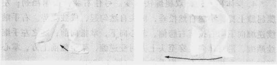 5. 身体右转变左转,右腿仍顺缠,弓膝塌劲;左腿仍逆缠, 提起左脚跟以前脚掌贴地向左后斜方撤步,成左前虚步。同时左 手继续顺缠,屈臂收肘至胸前,掌心向内,贴于腹前;随之右手 继续向右向上向内划弧至肩高,屈肘手变顺缠向内转至胸前,变 逆缠向前转出,掌心斜向右前下方,掌指斜向前。眼看右前方。 (ffl 4-285)