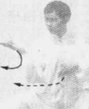 5. 身体右转,右腿仍顺缠,弓膝塌劲;左腿仍逆缠,提起 左脚向前上步,落于右脚内后侧,成左后虚步,两脚相距约一肩 宽。同时两手变逆缠,经颌下向右前斜角按出,手指同胸高,两 手相距约20厘米,两掌心斜向前下方,掌指斜向上。眼法不变。 (S5-22)