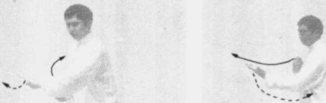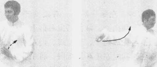 在第二动作时要注意,眼法要随身体转动而调整眼睛看的方 向。在第四动作中,注意右腿不可珍得过直。右脚尖一定要向内 扣,左手向左前开转时、右手在原位置配合左手随之转动。