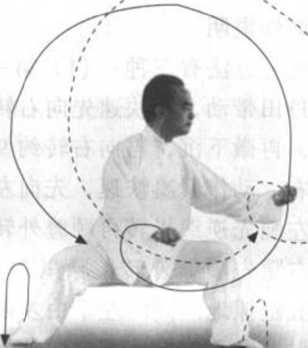 臂半圆,拳心向下,虎口向右后,距胸约30厘米;同时右勾手由右前逆缠 略向里合变拳向右下沉至右膝外随即向左至胸前中线里扣发劲,紧接着变顺 缠上翻发劲,位在右膝略前上,拳心向上、虎口向右,高度在胸部。眼先看 身左侧再看身右侧,耳听身后。