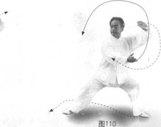 动作二:身向左转约20度螺旋下沉,重心在左。左腿顺缠外转,膝里 扣,脚掌踏实五趾抓地;右腿逆缠屈膝,脚提起里转(先上下相合、两膝相 合)向右侧迈步,以脚跟里侧着地,脚尖上翘里合。同时左手逆缠以大指向 左前略上领劲,位在左眼左侧前方,掌心向左前略上方,指尖向右里上;右 手在腹前继续顺缠领劲,腕外折,掌心向左偏前,指尖向右前方。眼看身右 侧,耳听身后。(图110)