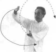 【要 点】 这动作练时速度很快。要求:上势拗鸾肘左手合击肘后, 劲不断紧接着快速接练此动作。右脚向左脚里侧旁并步时,左手上抛劲不 丢。
