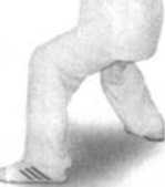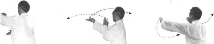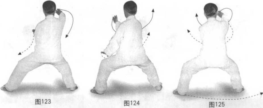 分三段:(1)身先略向右转,再左转,再向右转约45度,螺旋下沉, 重心略偏左。左腿逆缠里转,脚掌踏实,五趾抓地;右腿顺缠外转,膝里 扣,脚掌踏实,五趾抓地。同时左手由左肩左侧前顺缠下沉里合至两膝中线 前,悬臂、后翻腕,掌心偏右前,指尖偏左前;右手由右肩右侧前逆缠外拗 至右膝外侧,坐腕,指尖略偏右前上。眼先看左手再看右手,再看左侧外, 耳听身右后。(图123 ~ 125)