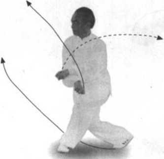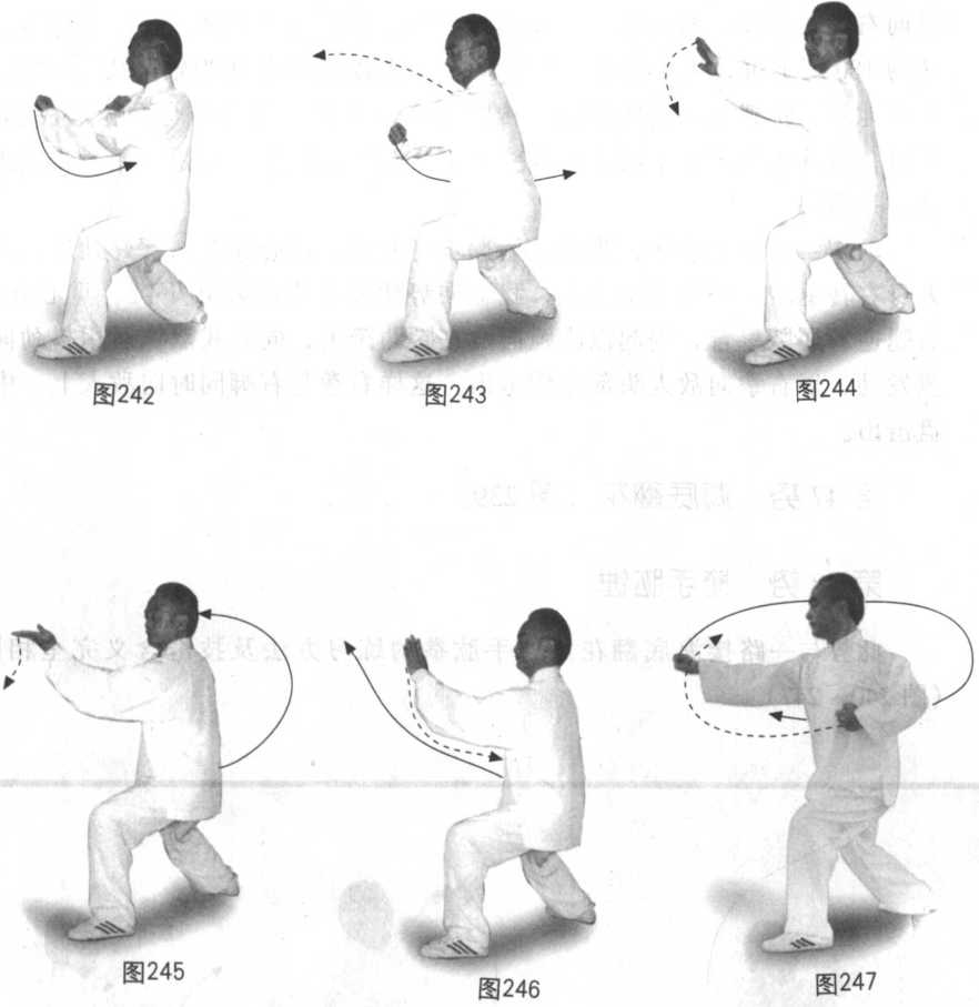 【要 点】 这动作练时速度较快。要求:身体向左转180度时要上下、 左右相合,双腿拗步旋转时,两大腿之间要留有空隙,勿贴近,裆要虚要圆°