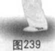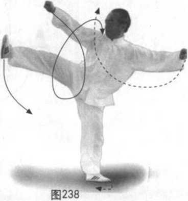 动作二:以腰为主宰结合丹田带动身快速先向下沉再螺旋上升,重心全 部放在左腿。左腿顺缠外转,屈膝里扣,脚掌踏实,五趾抓地;右腿逆缠里 转,屈膝提起里合,再向右侧上横蹬以脚踵发劲,脚尖略偏前上,高与肩 同。同时,双拳由左膝前略上方以双逆缠分向左右两侧与右脚同时发劲,双 拳心向下,右拳高,左拳略低。眼看身右侧,耳听身左后。(图238)