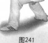 动作一:身向左转约180度螺旋下沉,重心由右移偏左。左腿由左侧上 顺缠外转下沉,以脚跟着地为轴脚尖外转180度落地脚掌踏实,五趾抓地; 右腿逆缠里转(当左脚踏实后)脚跟离地以脚尖点地为轴随身旋转,形成拗 步。同时,双拳在两侧先略双逆缠略上扬,变双顺缠下沉以左外上、右里下 双腕小臂交叉变双逆缠合于左膝前略上,双拳心向里,虎口向上。眼先看双 拳再看身右侧,耳听左后。(图237)