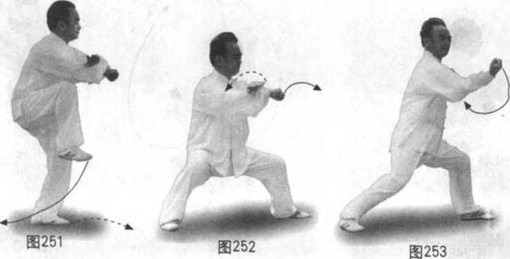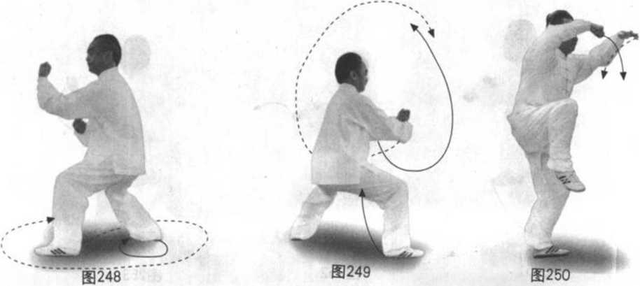 地,变逆缠里转(当右脚落地重心移右后),脚提起脚尖上翘里合随身右转 再以脚跟里侧着地旋转扫地,实际左脚贴地旋转扫地角度为450度。同时双 拳原位置不变,以双顺缠形成右拳与右脚的向心力,即小圈,左拳与左脚的 离心力,即大圈。眼看身右侧再看左脚,耳听身后。(图249)