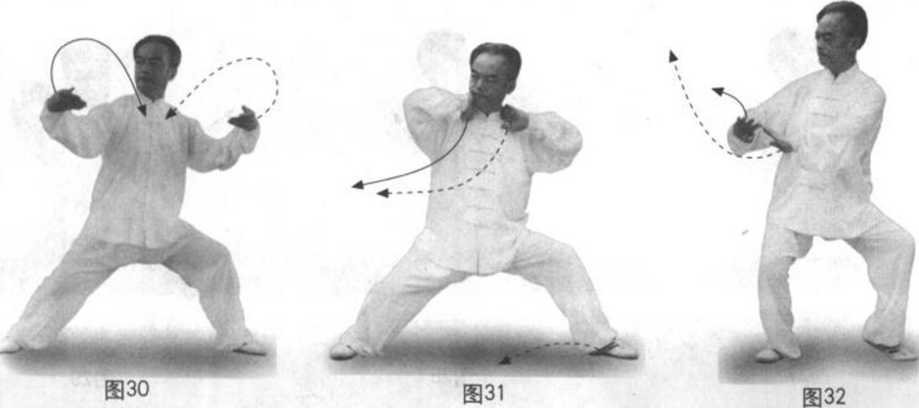 眼看右前下,耳听左后, 同时右臀及外胯略下沉再略上升由右后向右侧外旋转,突出右外胯。左胯 松,顺缠外转,膝屈外旋,脚跟提起,以脚尖里侧划后弧至右脚里旁略后, 脚尖向左外,虚步脚尖点地。左手臂逆缠,右手也逆缠,两手从两耳腮前下 经胸前向前略下由逆变顺缠推出,劲松运到中指肚,坐腕,掌心向右前下, 右手臂略高,两手指尖向前略相向斜线成八字形状。(图32)