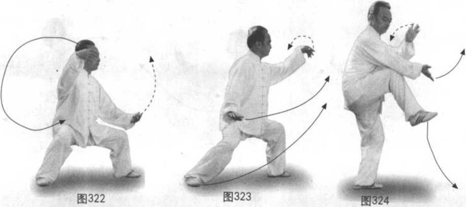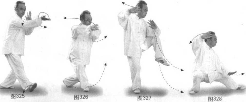 动作三:身继续向右转螺旋下沉,重心在右后。右腿顺缠外转,膝里 扣,脚掌踏实;左腿逆缠提起脚尖上翘(先肘膝,两膝合)里转向左前迈步 以脚跟里侧贴地蹬出。同时右手逆缠向右外略上展开,位在右眼右前略上 方,臂半圆,后翻腕,掌心向前上,指尖向左前偏上;左手由右肘弯里侧逆 缠向左前下沉,位在左膝里侧下,掌心向左下,指尖向前。眼先看右手再看 前,耳听身后。(图327、328)